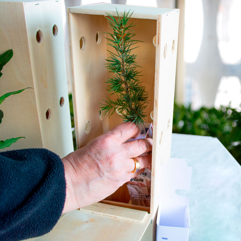 En nuestra presentación pack Dos Arbolitos en caja deluxe, enviamos dos arbolitos en caja de cartón dentro de una caja de madera. Esta presentación da a tu arbolito ese plus para convertilo en un excelente regalo. Puedes elegir entre cualquiera de las variedades de arbolitos disponibles en nuestro vivero. La presentación estándar incluye nuestro logo y la información y cuidados necesarios impresos en la caja. ¿Quieres una caja personalizada? No hay problema, podemos personalizar tanto la caja de cartón como la de madera con la imagen que tu quieras.